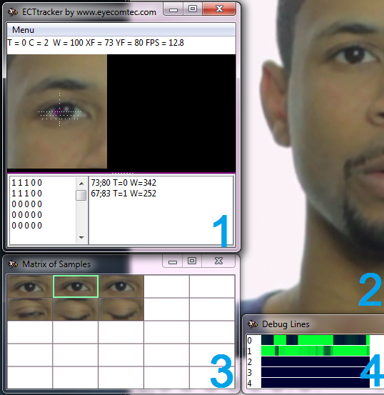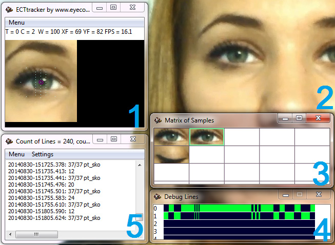 3 – the Matrix of Samples – the special table of the ECTtracker application, which contains small snapshots showing the user’s eyes in different states (both eyes open, closed, or only one eye is open). During its operation the software compares samples and the current image identifying the user’s state of eyes.