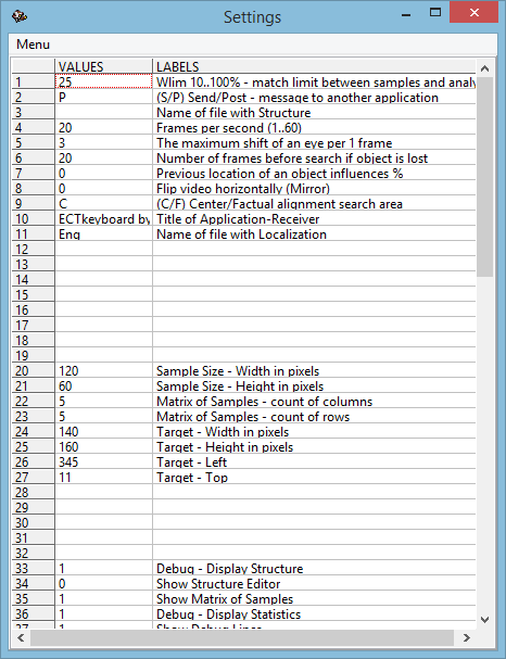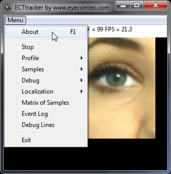 ECTtracker (EyeComTec Tracker) is an eye-tracking software which identifies visible actions performed by the user. It is mainly used to monitor the state of the user’s eyes (open or closed) but can also track the eyebrows or mouth. This software can be used in conjunction with different video capturing applications for web cameras or other devices connected to a PC (e.g. ECTcamera, Skype, Media Player Classic). ECTtracker compares different states of the user's eyes with assigned key codes, which can be further transmitted to any receiving application (ECTmorse, ECTkeyboard and many others). Software is extremely flexible and adjustable, as well as portable, and can be personalized for use for any specific user and the performance of a computer. In fact, ECTtracker is an alternative to smart computer vision realization.